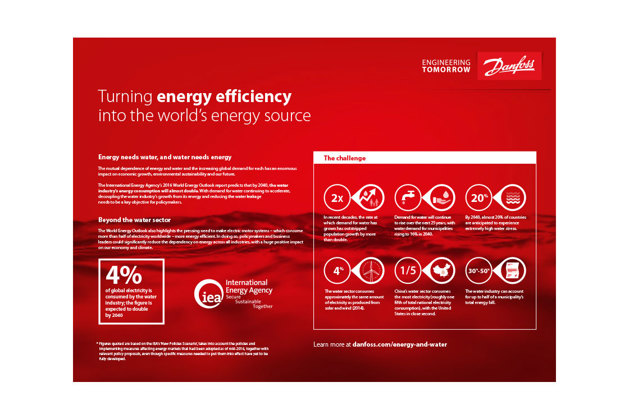Existing technologies designed to reduce energy consumption in all stages of the water cycle – from production and distribution to wastewater pumping and treatment – already exist. Denmark is expected to achieve this goal within a few years. Not only can the water cycle be made more efficient, it has the potential to actually generate energy. And as part of optimizing the energy consumption in the water distribution system, water leakage will be automatically reduced.
