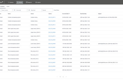 Overzicht van alarmen. Mogelijkheid om de alarmen te filteren op status (actief, inactief en datum).