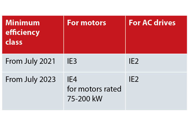 Двигателите, променливотоковите задвижвания и задвижващите системи са класифицирани според тяхната енергийна ефективност. От януари 2015 г. е законово изискване новите двигатели IE2 да изискват променливотоково задвижване за работа в Европа. От юли 2021 г. минималното изискване за ефективност на двигателя е клас IE3, а от юли 2023 г. минималното изискване за двигатели в диапазона 75-200 kW ще бъде IE4. За задвижванията с променлив ток минималното изискване е IE2 от юли 2021 г. Стандартът IEC 61800-9-2 определя класовете IE за задвижванията с променлив ток, а също и класовете IES за системите за задвижване (комбинирани двигатели и задвижвания).