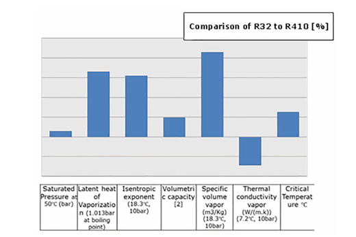 De termodynamiske egenskaber har stor indflydelse på systemets og kompressorens ydeevne. Figur 1 viser sammenfattet oversigt over sammenligningen mellem R32 og R410A.