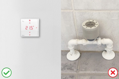 - Radiatoren skal være placeret i umiddelbar nærhed af vinduet (hvilket oftest er tilfældet). Hvis radiatoren f.eks. er placeret 10 meter fra vinduet, kan det være svært for termostaten at fornemme et entydigt fald i temperaturen, som er nødvendigt for at kunne slukke for varmen.