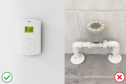 Som en tommelfingerregel sidder termostaten for oven radiator med fremløb (se billedet til venstre).