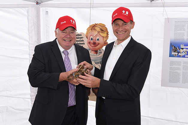 Jørgen M. Clausen, Aufsichtsratsvorsitzender von Danfoss, und Firmen-Präsident Kim Fausing (rechts) mit dem weltweit ersten Heizkörperthermostat von Danfoss aus den Jahr 1943