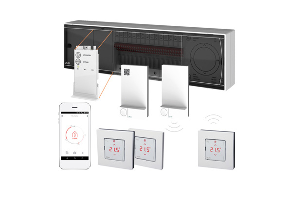 The most advanced floor heating and cooling control systems add a variety of special features to the Master Controllers in order to optimize energy efficiency and user comfort. Danfoss, for example, offers a combined 24 volt & wireless control system with several modules and accessories, allowing advanced cooling control, demand-based supply temperature and much more.