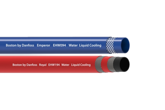 Part of the Boston by Danfoss line, the Emperor EHW094 and Royal EHW194 hoses offer superior performance and high flexibility for electric vehicles, data centers, and other liquid cooling needs. As electric equipment becomes more powerful and complex, liquid cooling has emerged as a more energy-efficient and cost-effective alternative to air cooling systems. Both Emperor EHW094 and Royal EHW194 hoses are optimized for liquid cooling applications to provide reliable and leak-free fluid conveyance.Liquid cooling can significantly improve efficiency, introducing new possibilities for machine design.