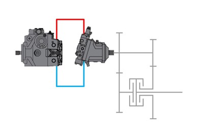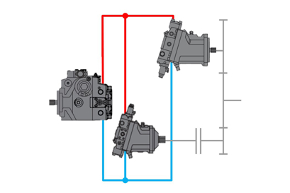 One-pump, two-motor system with a torque summation gear box. Ideal for high corner power applications, such as wheel loaders and large forestry machines.