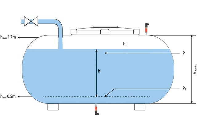 The water level can be calculated by using the water density. A pressure sensor can help us to measure the hydrostatic pressure and to define the water level column. The tank geometry can be used to calculate the water volume, if necessary.