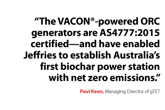 “The VACON®-powered ORC generators are AS4777:2015 certified — and have enabled Jeffries to establish Australia’s first biochar power station with net zero emissions,” explained Paul Keen, Managing Director of gTET.