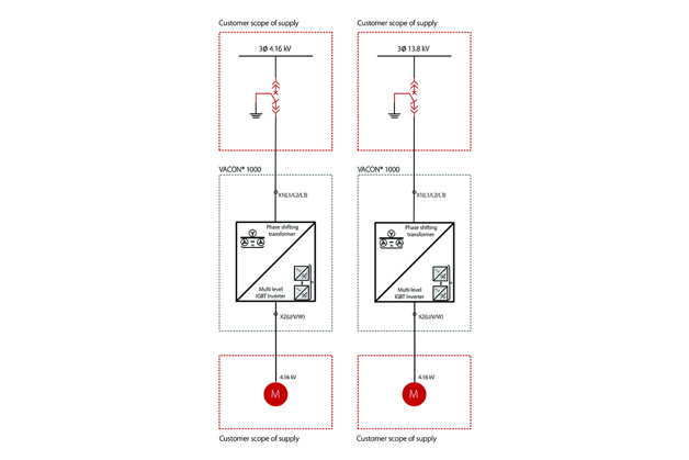 VACON® 1000 es un variador de frecuencia de uso general adecuado para una amplia gama de aplicaciones de media tensión. Es fácil de integrar en los principales sistemas de control y se adapta rápidamente a las necesidades específicas de cada situación. Este variador de media tensión ofrece alta resistencia ambiental para operar en condiciones adversas, con alta temperatura, polvo y humedad dentro de una sala eléctrica.