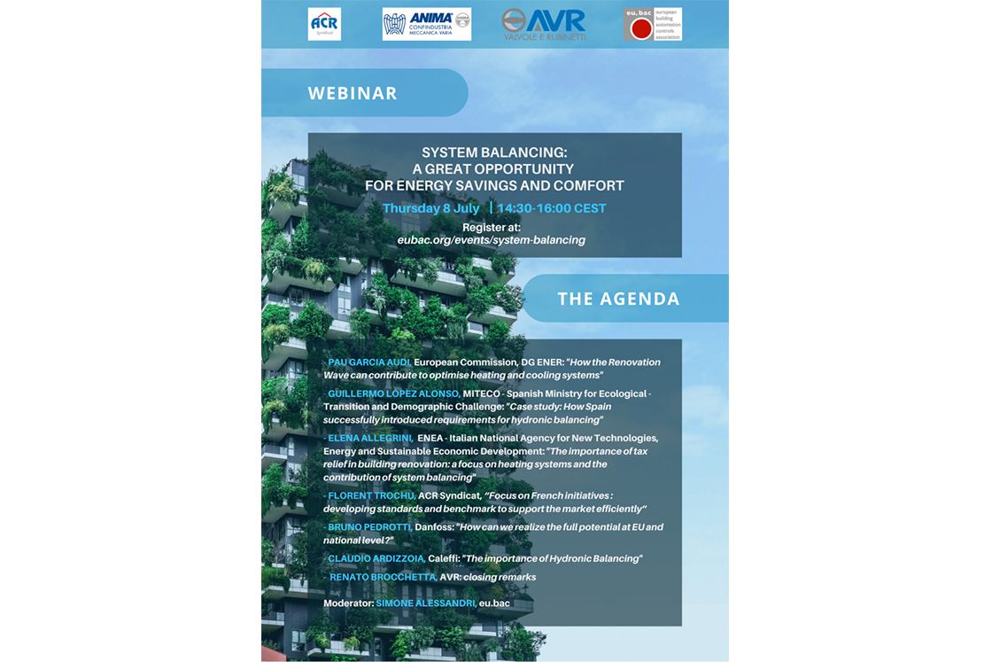 Giovedì 8 Luglio alle 14:30 l'Associazione Europea per l'Automazione e il Controllo degli Edifici (EU.BAC) terrà un webinar sui vantaggi dell'utilizzo di sistemi di bilanciamento negli impianti esistenti.