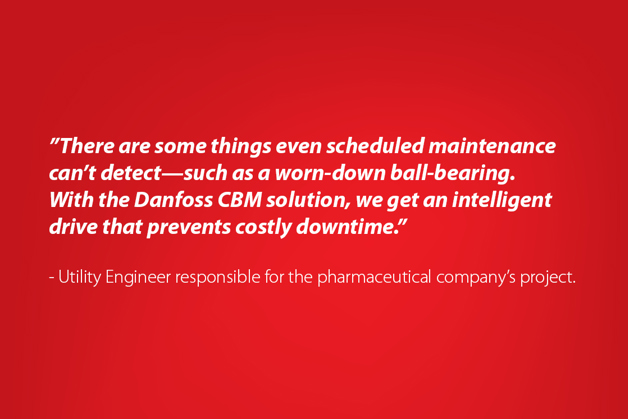 A Danfoss propôs o VLT® HVAC Drive FC 102 com monitoramento baseado em condições (CBM) integrado para o sistema HVAC da empresa farmacêutica. Uma solução CBM capacita o conversor a operar como um sensor inteligente, monitorando a condição do motor para detecção precoce de potenciais problemas, como vibração mecânica dentro de uma UTA (Unidade de Tratamento de Ar). Isso significa que o drive inteligente não produz apenas dados, mas também interpreta as informações em insights acionáveis para manutenção preventiva.
