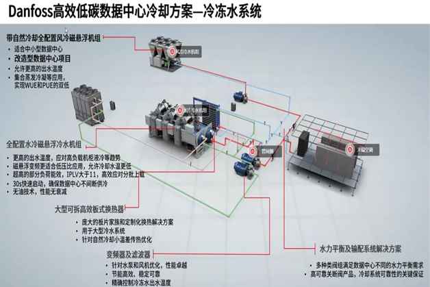 資料中心是能耗大戶,其中用於資料中心冷卻的能耗占比高達30%。丹佛斯致力於開發可降低PUE值的高效解決方案,透過創新的冷卻技術、熱回收綜合能源利用、智慧微網電源管理、高壓細水霧消防等解決方案幫助資料中心實現碳中和及可持續發展。